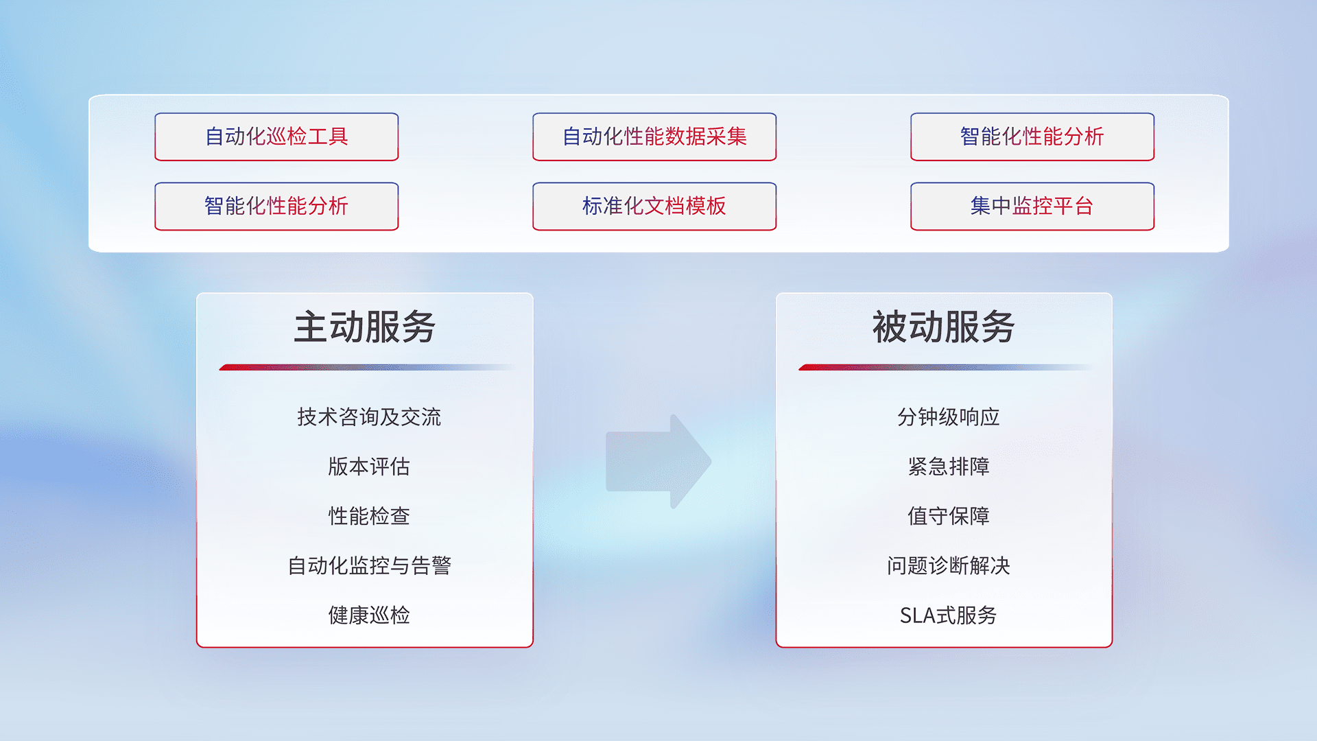 智能化工具和标准化文档,,保障服务质量,,,提供主动服务(包含技术咨询、、、、版本评估、、、性能检查、、、、自动化监控与告警、、、健康巡检)和被动服务包含(分钟级响应、、、紧急排障、、、值守保障、、问题诊断解决、、、SLA服务)。。